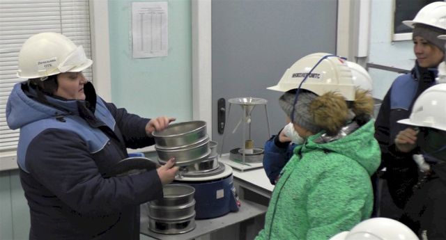 Знакомство с предприятием начали с просмотра фильма по охране труда. Пройдя вводный видеоинструктаж, школьники, как полагается, надели необходимые средства индивидуальной защиты – каски, беруши, респираторы. А потом отправились смотреть участки сухого и мокрого помола и отдел технического контроля.