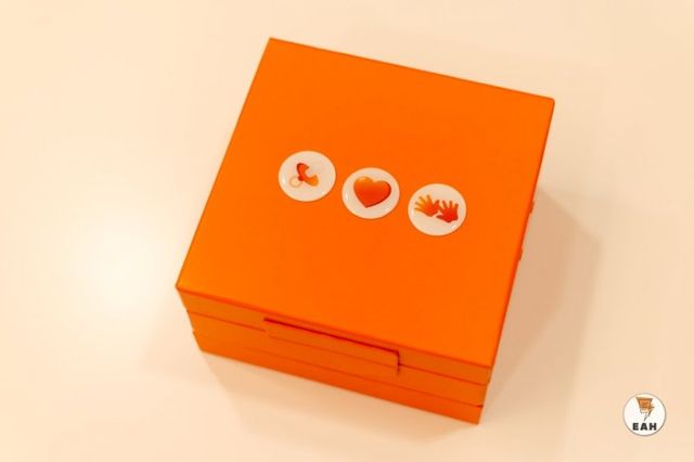 Второй необычный подарок от нас – это так называемая «капсула времени», представляющая собой небольшой оранжевый сундучок. У моей мамы бирка из роддома и мои волосы хранятся в рыжей коробочке из-под драгоценностей. Мы решили сделать что-то подобное и вручаем пациенткам «капсулу времени», которую можно заполнять – положить туда первые волосики, первый зубик малыша.