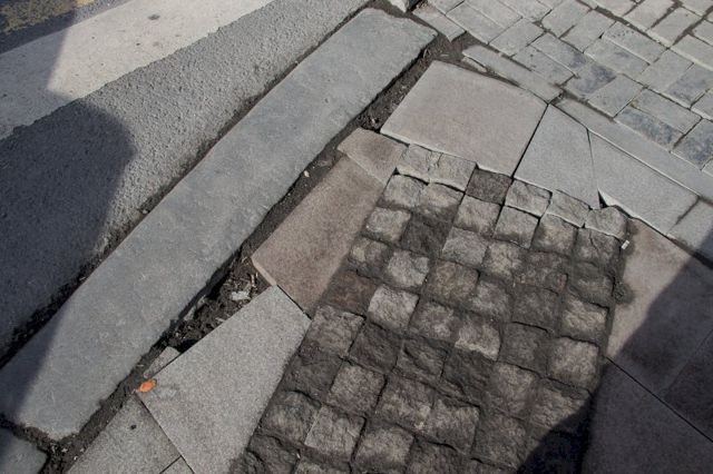 Новая плитка местами выглядит как старая. Трещины, сколы, зазубрины, запилы на граните встречаются по всему тротуару.