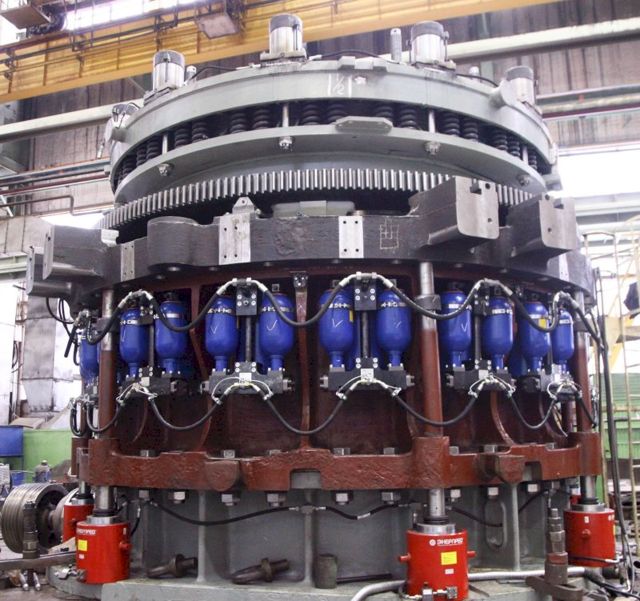Инновационное конструкторское решение максимально сократит нагрузку на металлоконструкции, обеспечит равномерность и управляемость увеличенного усилия (1200 т). Все это позволяет, не повышая массу и размеры установки, добиться значительного роста ее производительности. Дробилка оснащена 18 гидропневмоблоками, изготовленными по заказу и чертежам Уралмашзавода ведущим немецким производителем этого вида оборудования.