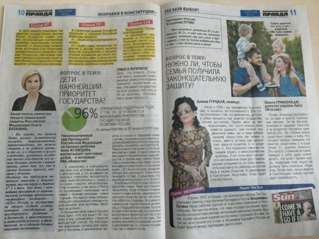 В Екатеринбурге начали распространять специальный изданный десятимиллионным тиражом выпуск газеты «Комсомольская правда». Продукт «Поправки в Конституцию – это мой выбор!» полностью посвящен ответам на вопросы о новой редакции Конституции, скорректировать которую предложил президент Владимир Путин.