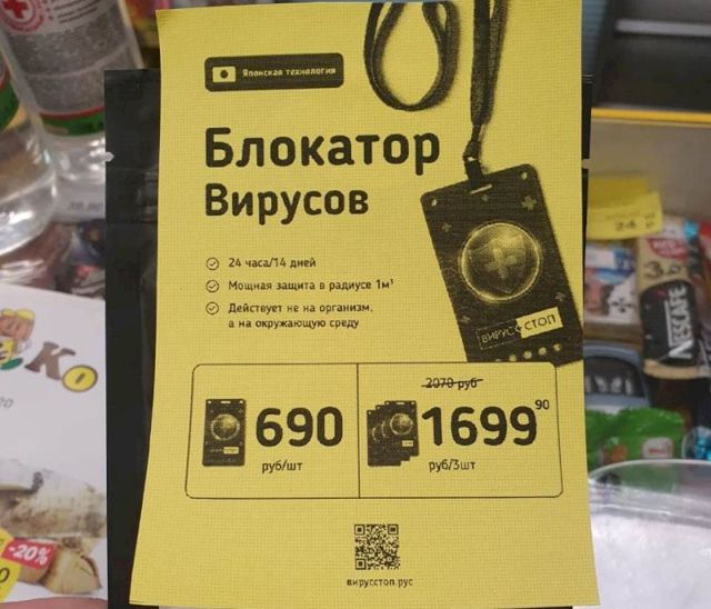 Средство называется «Вирус стоп», стоит почти 700 рублей и заявляется как «блокатор вирусов». Согласно надписи на упаковке, в состав входят хлорит натрия и цеолит. В инструкции указано, что «бейдж» надо прицепить к одежде или рюкзаку — своими испарениями тот, якобы, будет очищать воздух на протяжении двух недель. Отметим, что продается новинка почему-то в алкомаркетах, а не в аптеках.