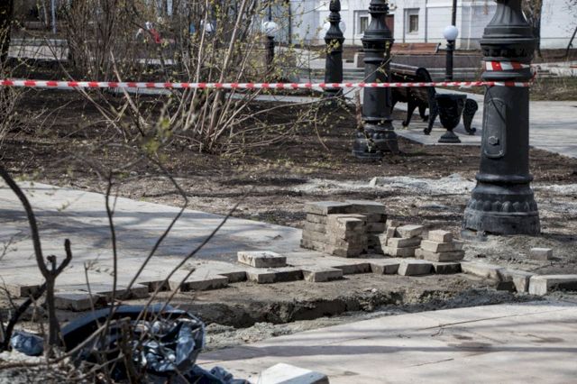 Зимой по свежеуложенным тротуарам ездила снегоуборочная техника, и поверхность пошла волнами. Под плитку, объяснил строитель, попадала вода, лед, и отдельные бруски выдавило вверх. Рабочие намерены за несколько дней заменить сколотую плитку, выровнять ее по высоте, замести песком стыки.