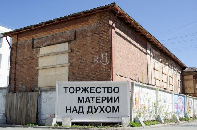 Екатеринбургский уличный художник Илья Мозги создал новый объект стрит-арта. На строительном заборе вокруг законсервированного здания на улице Шейнкмана появилась надпись: "Торжество материи над духом, когда-нибудь рухнет".