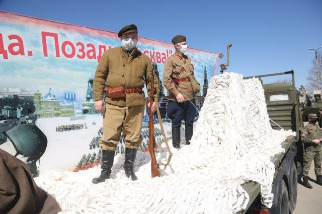 «В статическом показе на платформе будут участвовать скульптурные группы в исполнении артистов ансамбля песни и пляски ЦВО в одежде времен Великой Отечественной войны: пилотках, шапках-ушанках, ватниках и брюках галифе. Каждый артист будет изображать собирательный образ героя-фронтовика: девушку-радистку и зенитчицу, партизана, матроса, политрука, поднимающего батальон в атаку и лыжника в маскхалатах», - рассказывают в пресс-службе.