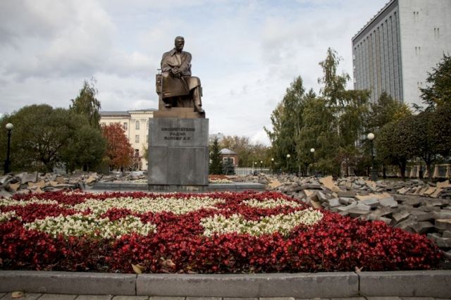 В Екатеринбурге на время отказались еще от одной многолетней традиции - шествия студентов и выпускников радиофака УПИ-УрФУ и помывки памятника изобретателю радио Александру Попову (скульптор В.Е. Егоров, архитектор П.Д. Деминцев).