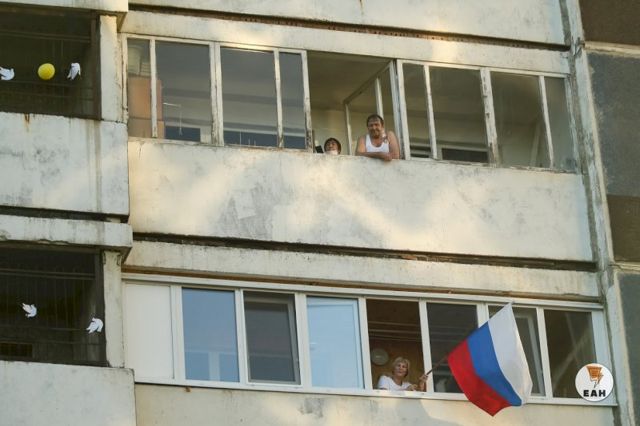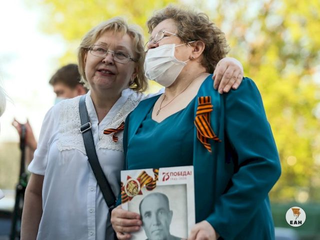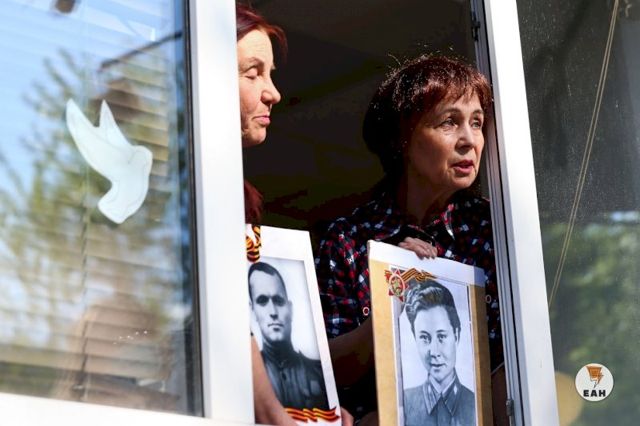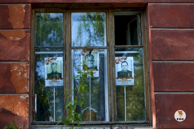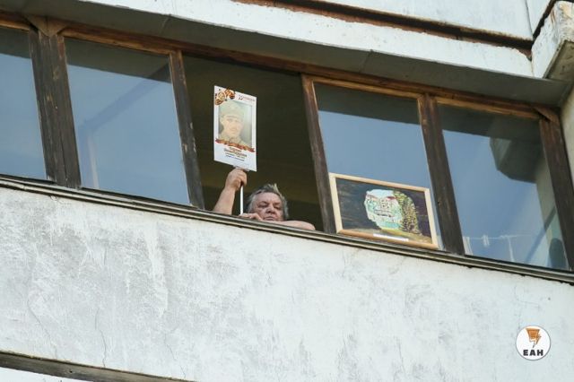 Жители многоэтажного дома на Эльмаше устроили полноценный домашний «Бессмертный полк». Люди в назначенное время вышли на балконы с портретами героических предков под песнь «День Победы».