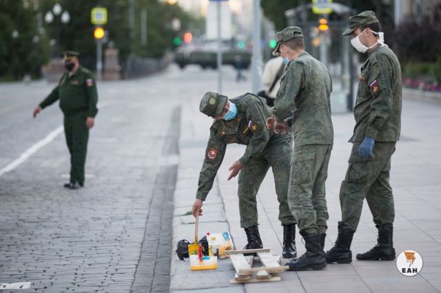 Перед ночной репетицией пеших парадных расчетов к параду Победы мобильные расчеты войск радиационной, химической и биологической защиты Центрального военного округа провели дезинфекцию Площади 1905 года в Екатеринбурге.