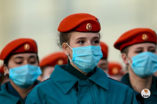 Перед началом тренировки мобильные расчеты войск радиационной химической и биологической защиты ЦВО провели специальную обработку Площади 1905 года, продезинфицировали места построения и линию прохождения парадных расчетов, всего более 7 000 кв. м.