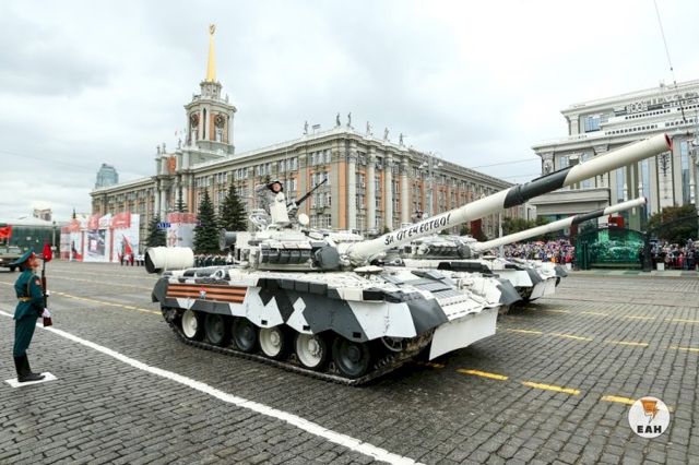 Под военные марши по площади проехала современная и историческая военная техника. В том числе впервые принимающие участие в параде Победы артиллерийские установки «Малка», танки Т-80 и Т-72Б3М, а также образцы вооружения, окрашенные в цвета подразделений, действующих в арктических широтах - бронетранспортеры БТР-82АМ, легкие пикапы «УАЗ» с турелью для крупнокалиберных пулеметов. Всего около 140 единиц военной техники – что является своеобразным рекордом для Екатеринбурга.