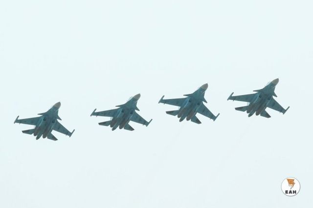 В воздушном парадном строю над Екатеринбургом пролетели 23 самолета и вертолета: сверхзвуковые высотные истребители-перехватчики МиГ-31БМ, многофункциональные истребители-бомбардировщики Су-34 поколения 4++, самолеты-разведчики Су-24МР, боевые ударные вертолеты Ми-24, военно-транспортные вертолеты Ми-8, крупнейший в мире серийный транспортный вертолёт Ми-26, транспортные самолеты Ан-12, Ан-26, Л-410 и впервые пассажирский самолет Ту-134УБЛ.