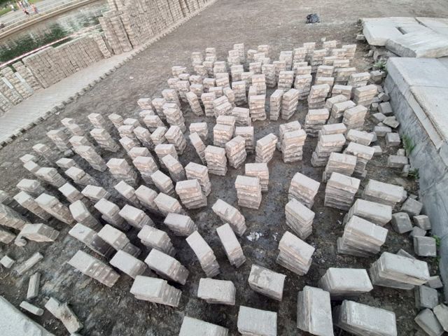 На екатеринбургской Плотинке разобрали бехатоновые тротуары. Место проведения работ не просто обозначили полосатой лентой – вокруг очищенных от старой плитки пространств возведены «крепостные стены» из бехатона.