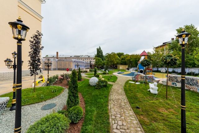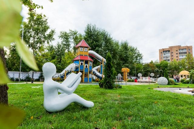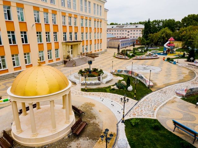 В школе отремонтировали кабинеты физики, химии, биологии и информатики, общие зоны и благоустроили территорию: установив газоны и клумбы, литые ворота, беседка, скамейки, фонари, скульптуры.