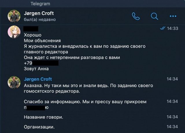 В воскресенье, 6 сентября, ко мне в личку пришел сам лидер движения Йорген Крофт, который до этого игнорировал все мои вопросы на тему обращений, которые он пишет в правоохранительные органы про Неделю гордости.