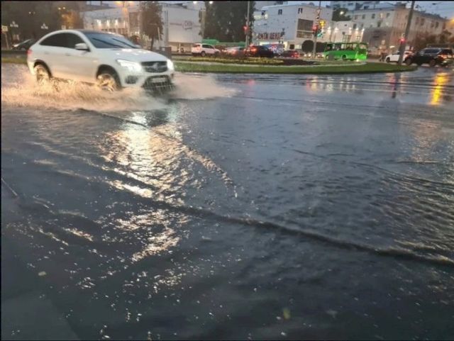 Накануне из-за проливных дождей подтопило проспект Ленина возле администрации города и в районе пересечения с улицей Луначарского. Кроме проезжей части, под воду ушла часть тротуаров.