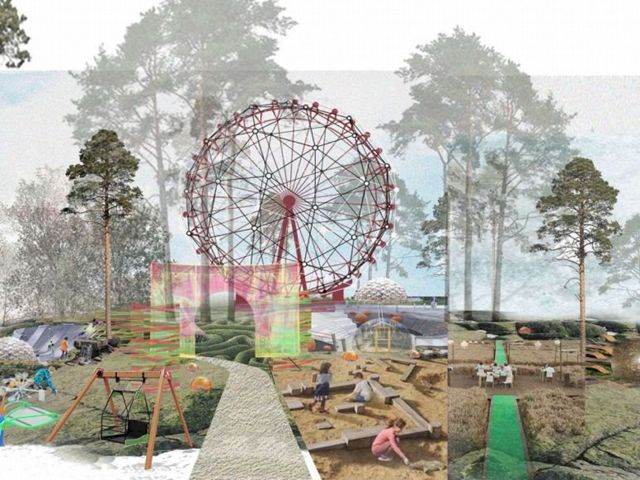 Важной составляющей проекта-победителя стало благоустройство территории у подножия колеса. К новой площадке будут вести витиеватые дорожки, похожие на радиальный лабиринт. Такое размещение позволит отказаться от крутых подъемов, сделать пологие тропы доступными для всех — так парк поддерживает инклюзивную среду для посетителей. Уклон около колеса также позволяет реализовать игровые механики, основанные на спуске-подъеме: всесезонные горки, подъемы с канатом, скалолазную стенку и др. Планируется создание детской игровой площадки с возможностью проведения мероприятий, экспериментов и опытов в естественной среде: игры с водой, деревом, песком и др.