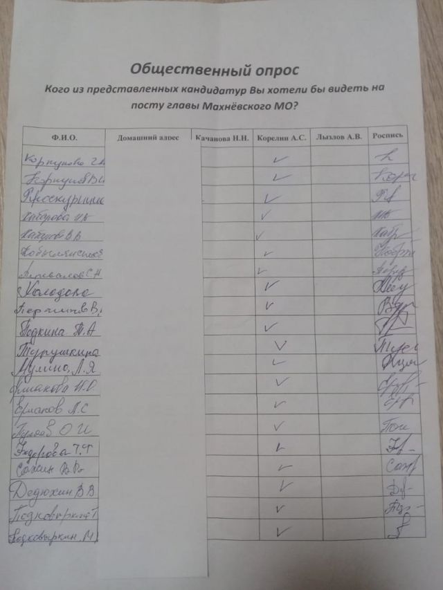 В магазинах поселка с трехтысячным населением появились подписные листы общественного опроса. В них жителям задается простой вопрос: «Кого из представленных кандидатур вы хотели бы видеть на посту главы Махневского МУ». Здесь же приводятся фамилии трех претендентов на место. Это бывший глава Александр Лызлов, бывший начальник ОМВД Режевского района подполковник Алексей Корелин и начальник отдела по управлению имуществом и земельными ресурсами местной администрации Нина Качанова. По словам инсайдера, «проголосовали» уже более 600 человек. Причем большая часть голосов отдана за экс-полицейского.