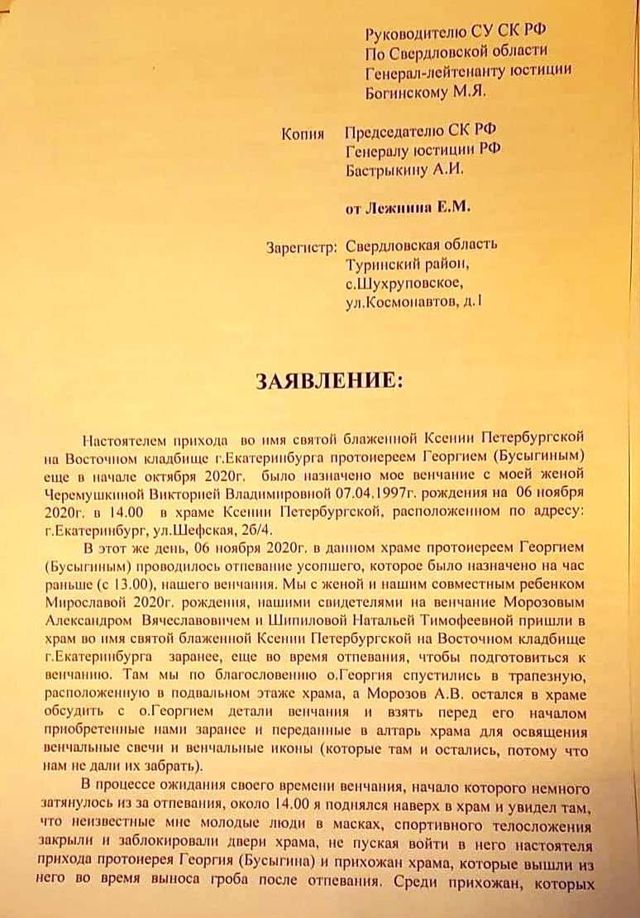 Авторами обращения выступила супружеская пара, которая пыталась повенчаться в день изгнания из прихода протоиерея Георгия Бусыгина.
