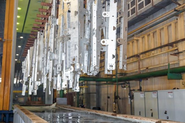 Отделение горячего цинкования оснащено современным оборудованием, соответствующим мировым практикам и производителям: Westech (США), KÖrner (Австрия), W.Pilling (Германия). Установленные ванны позволяют сегодня цинковать металлоконструкции с габаритными размерами до 12,5 м х 1,4 м х 3,2 м, весом до 3 тонн, при толщине цинкового покрытия от 40 до 200 мкм. Также в отделении работает линия для цинкования мелких изделий, которая представляет собой замкнутый конвейер, работающий в автоматическом режиме. Навешанные изделия проходят последовательные стадии обработки: механическую очистку в дробеметной камере (машина по очистке поверхности металлических изделий от ржавчины), промывку, флюсование, сушку, цинкование, охлаждение и съем. Размеры ванны цинкования составляют 7 х 1,2 х 2,3 м.
