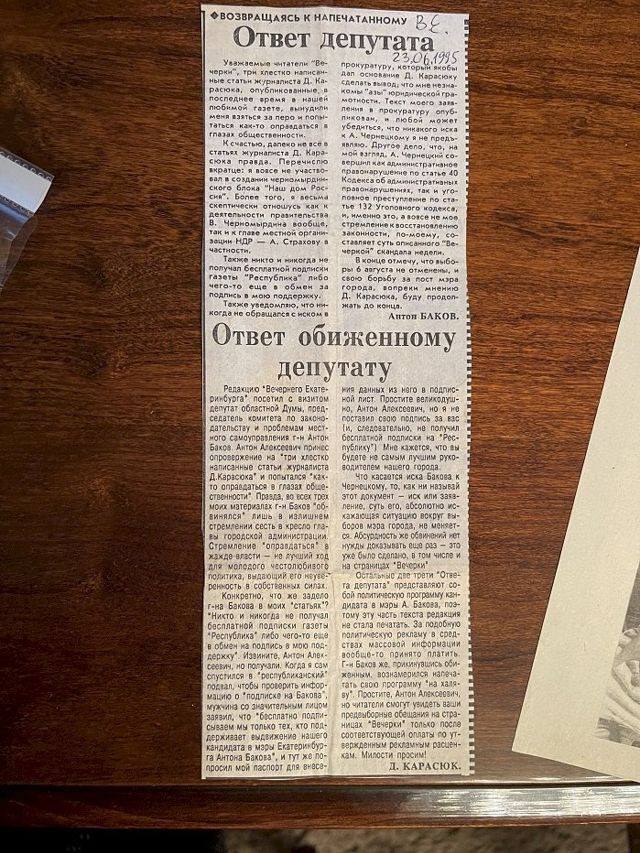 Вообще это были последние «советские» выборы в Екатеринбурге. Я первым, наверное, выступил за создание системы доставки нормальной питьевой воды, которая сейчас продается в любом магазине. Тогда это казалось дикостью. Главный инженер ЗиК Бутрин говорил мне: «Что вы, Антон Алексеевич, глупости говорите? Достаточно ведь поставить обычный фильтр – и будет чистейшая вода!»