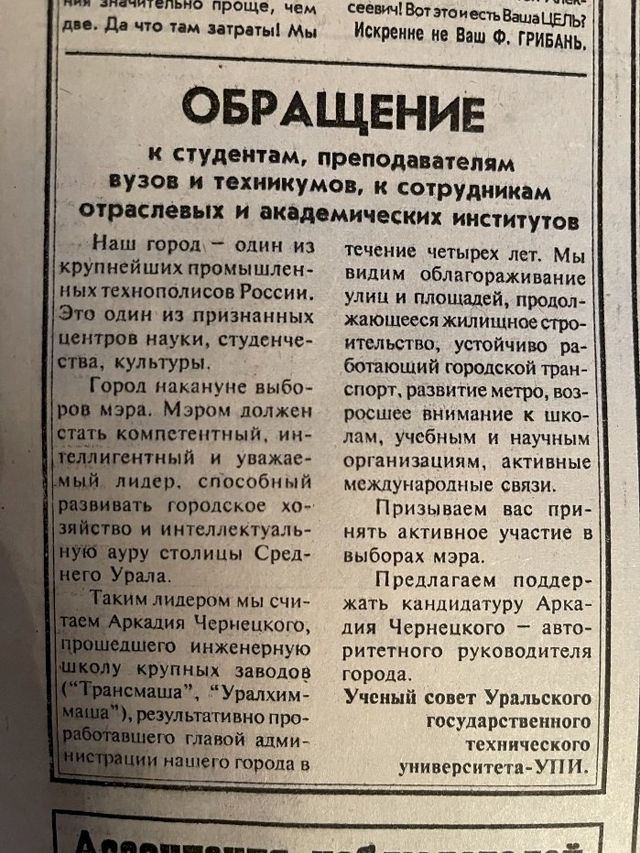Вся история выборов мэра Екатеринбурга пока — это история выборов Аркадия Михайловича Чернецкого. Я не считаю его хорошим главой города, он был достаточно консервативным руководителем администрации. С другой стороны, нам повезло, что это не был уголовный мэр-бандит. Он пытался отжать только то, что считал своим.