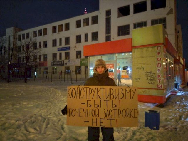 «Конструктивизму – быть, точечной застройке нет», - так написано на плакате активиста.