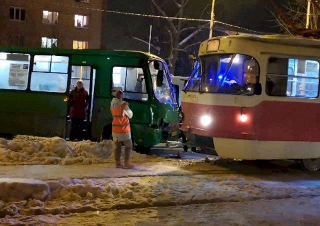 В Екатеринбурге на пересечении улиц Титова — Ферганская сегодня вечером столкнулись маршрутный автобус и трамвай, сообщают подписчики паблика «Инцидент Екатеринбург» в Telegram-канале.