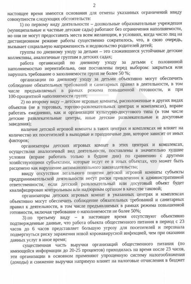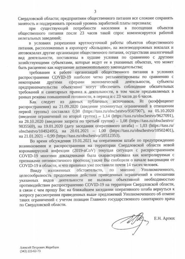 С последним документом рестораторы обратились к Уполномоченному по защите прав предпринимателей в Свердловской области Елене Артюх на прошлой неделе. В нем коммерсанты пожаловались на снижение выручки на 20-30%. Легальная деятельность дискотек, караоке-клубов фактически приостановлена, что увеличивает вероятность коррупционной составляющей. Также ночной ресторанный запрет ведет к снижению отчислений в бюджеты различных уровней в виде налоговых поступлений от легального оборота у предприятий общественного питания (в том числе алкогольных напитков).