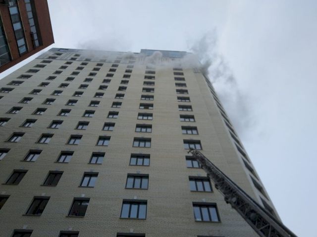 Спасатели проверяют информацию о том, что в горящем 23-этажном здании могут находиться люди.