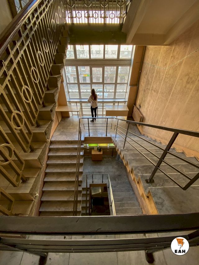 Менее ухоженным выглядит здание по адресу Ленина, 41, где в советские годы размещался «Уралснабторг». Впрочем, в этих темных лестничных пролетах и обшарпанных стенах есть своя эстетика. Ее очень хорошо понимают художники.