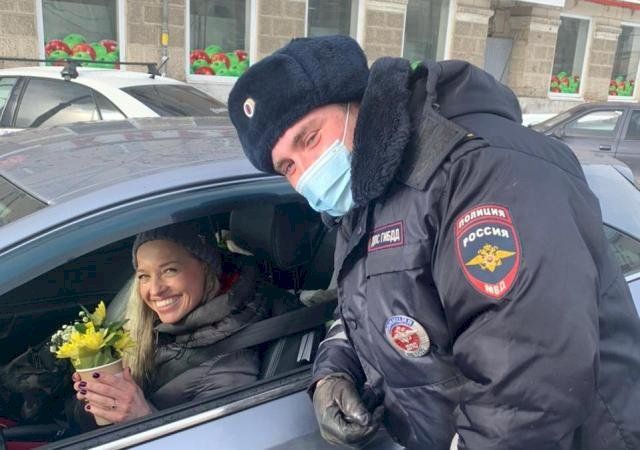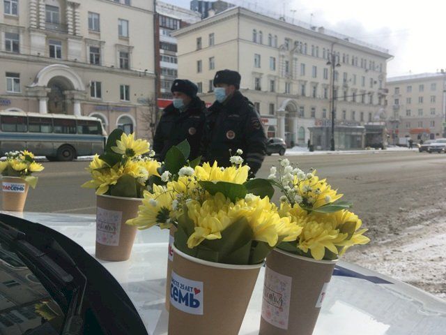 В Екатеринбурге сотрудники полиции по случаю приближающегося Международного женского дня дарили горожанкам цветы.