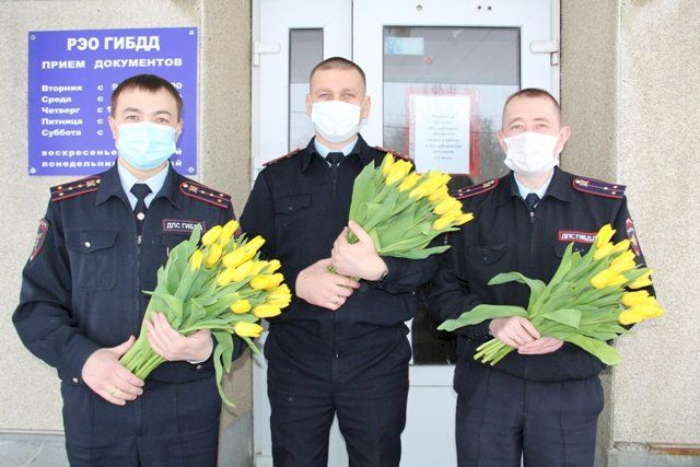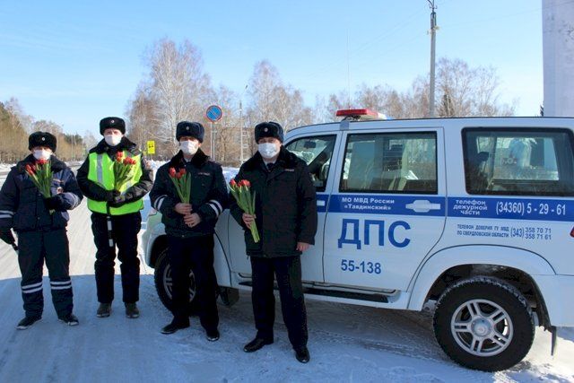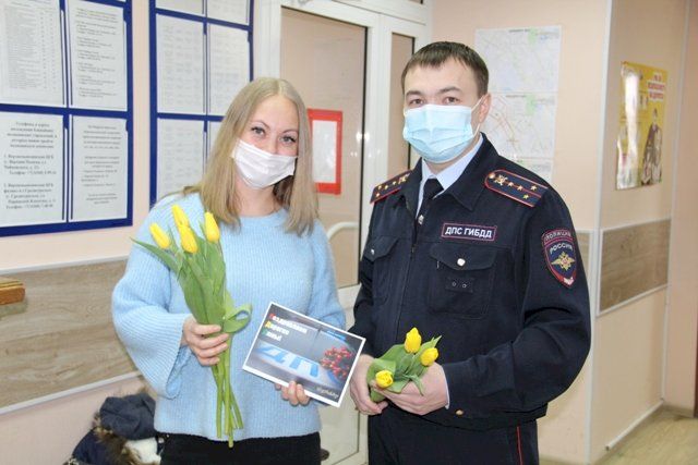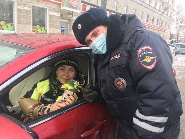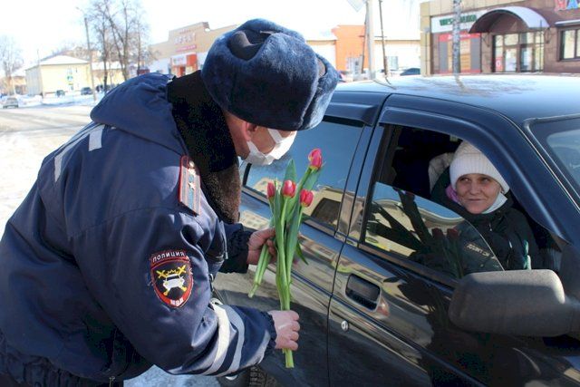 Поздравляли женщин и на улицах города. Госавтоинспекторы дарили цветы женщинам за рулем.