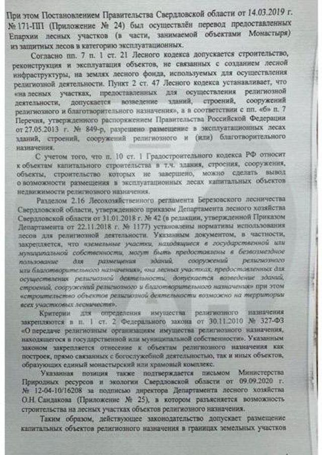 «Работы по строительству здания и сооружения на территории монастыря осуществлялись хозяйственным способом. В этой связи в достаточном объеме восстановить проектную документацию в настоящее время не представляется возможным. Источником средств для строительства были пожертвования, поступающие в адрес Екатеринбургской Епархии», - сказано в документе.