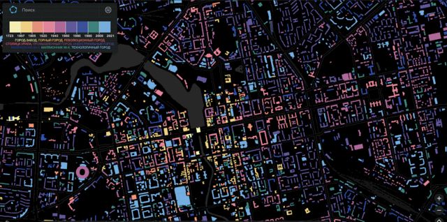 В связи с этим появилась мысль выделить этапы застройки в соответствии со статусом города. Образованные категории четко объединяют городскую застройку на периферии в кластеры и указывают на ассорти из возрастов застройки в центре Екатеринбурга», - рассказали о карте создатели.