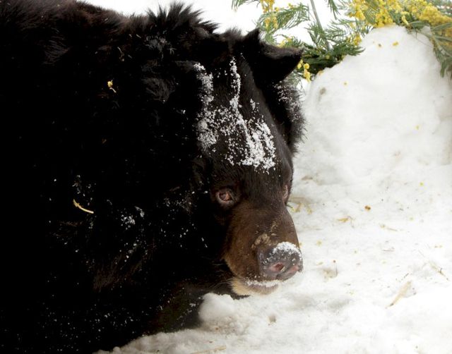 Остальные медведи пока только просыпаются. Самая пожилая медведица зоопарка – сорокалетняя Ветка – совершила небольшой моцион по вольеру, понюхала цветы и ушла досыпать в тепло.