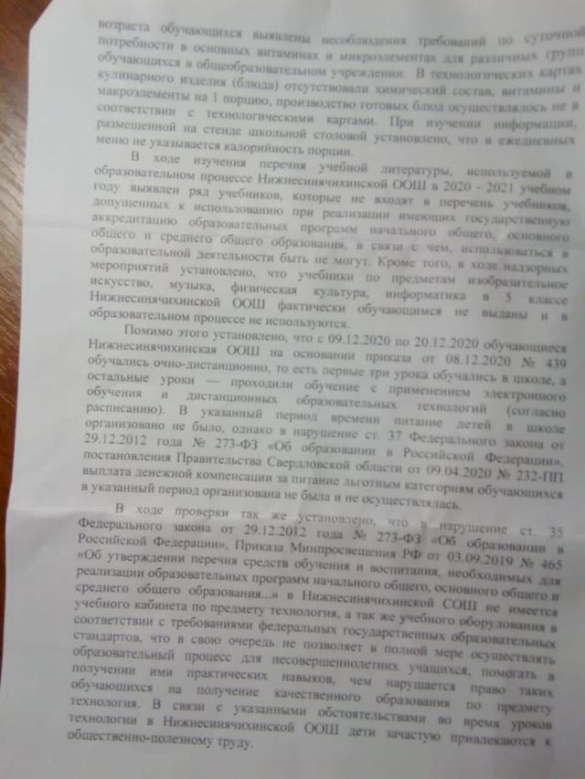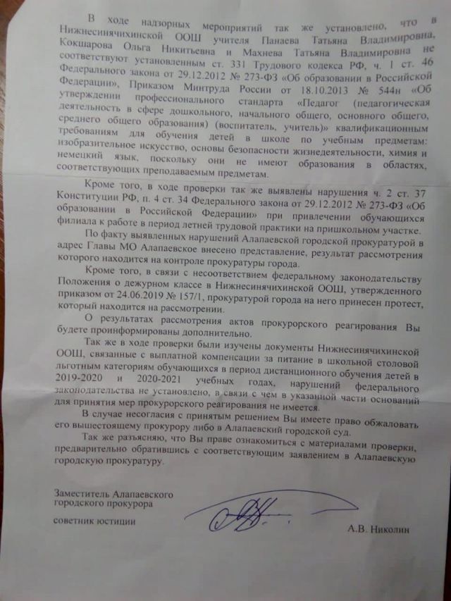 Прокуратура Алапаевска в ходе проверки выявила нарушения в филиале Верхнесинячихинской школы № 2 в Нижней Синячихе. Школу возглавляет депутат Алапаевской районной думы Наталья Курильщикова. Сотрудники надзорного ведомства пришли в школу после жалобы, которую написала председатель школьного родительского комитета Людмила Кокшарова.