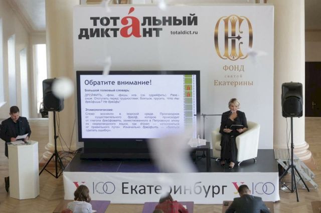 Главным лекторием мероприятия стала аудитория в Уральском федеральном университете. Здесь текст диктанта прочитала легендарная телеведущая, журналистка и актриса Татьяна Веденеева. Поучаствовать в акции в Екатеринбурге ее пригласил Фонд святой Екатерины, который с 2018 года выступает партнером «Тотального диктанта». В самом начале она пообещала прочитать текст «Фата» Дмитрия Глуховского так, чтобы большинство из присутствующих получили оценку «отлично».
