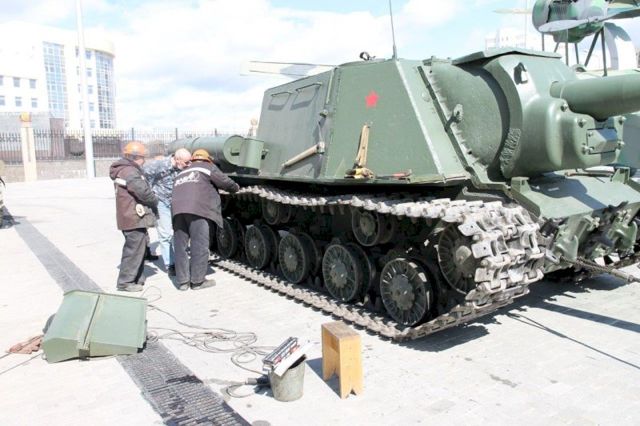 «Процедуре подверглись в первую очередь тяжелые машины. На гусеничные траки наварили специальные накладки. Они снижают удельные нагрузки на грунт и исключают разрушение асфальта. Предосторожность не лишняя – вес отдельных самоходных орудий достигает нескольких десятков тонн, а до 9 мая боевая техника выйдет в город еще дважды – 3 и 7 мая», - рассказал старший техник-механик отдела технического отдела обслуживания и реставрации техники музейного комплекса УГМК Александр Викторов.
