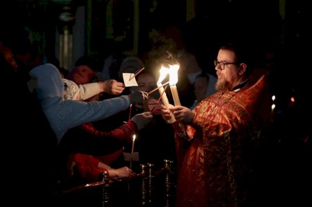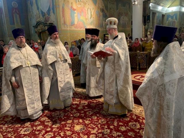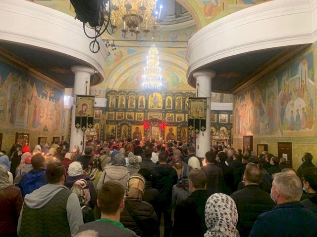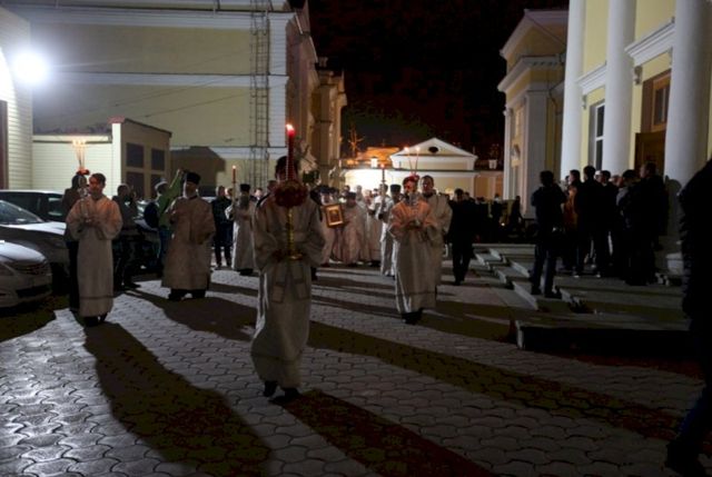 Прямо в терминале аэровокзала отец Максим Миняйло и директор Фонда святой Екатерины Александр Андреев передали огонь в несколько церквей и храмов региона. Под колокольный праздничный звон и пение стихиры «Воскресение Твое, Христе Спасе» вокруг собора был совершен крестный ход, который возглавил владыка Евгений. За Божественной литургией звучало Пасхальное Евангелие на разных языках. После Божественной литургии священнослужители традиционно освятили пасхальную снедь, которую принесли прихожане.