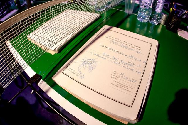 На столе у актеров разложены папки с делом 18-летнего чеченского юноши, которого обвиняют в убийстве приемного отца: