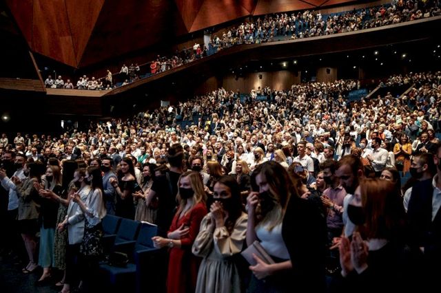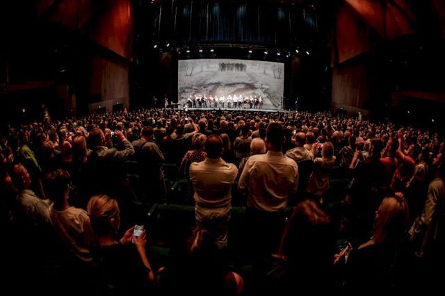Зал выставочного центра «Екатеринбург-Экспо» был заполнен, постановка была закрытой. Как пояснил организатор показа, один из учредителей Фонда святой Екатерины Андрей Симановский, всего было разослано порядка 4 тысяч приглашений.