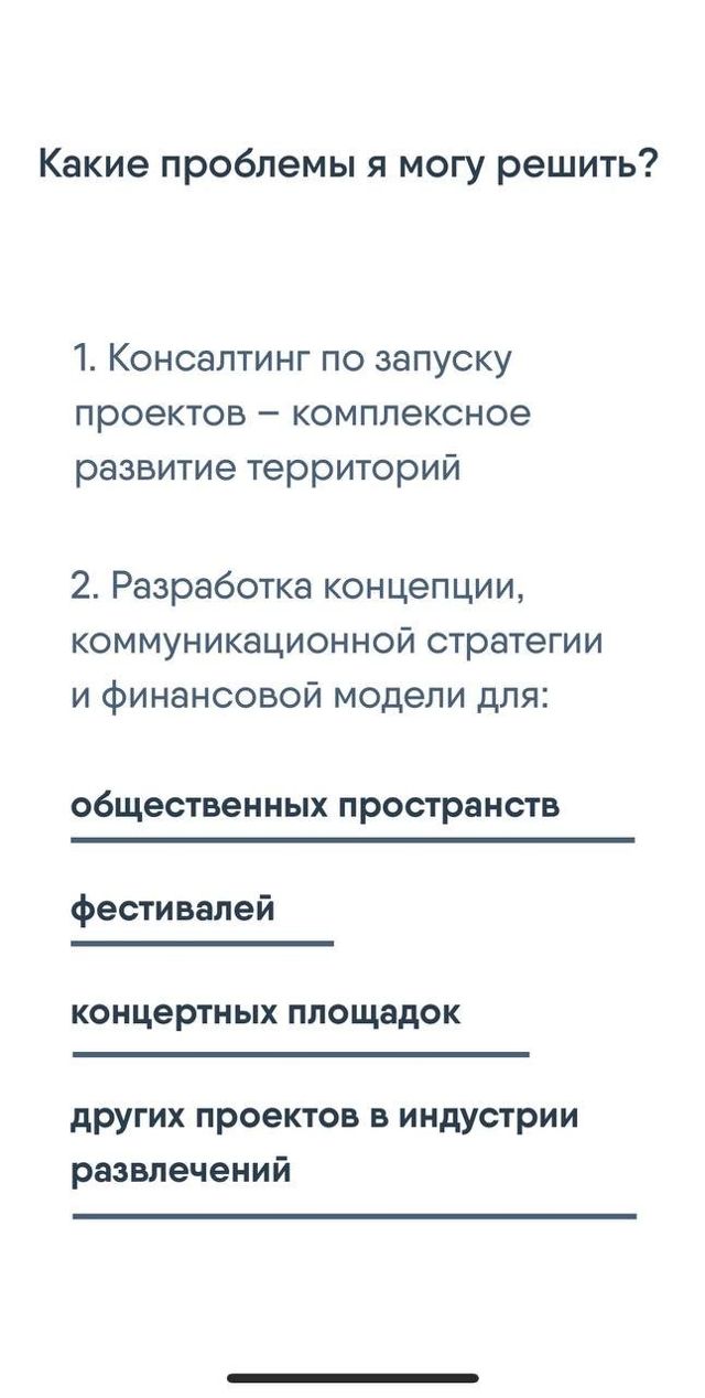 На интернет-странице доступна запись на консультацию по запуску общественных пространств, фестивалей, концертных площадок и других проектов в индустрии развлечений, зафиксировано предложение разработать для них концепцию, коммуникационную стратегию и финансовую модель.