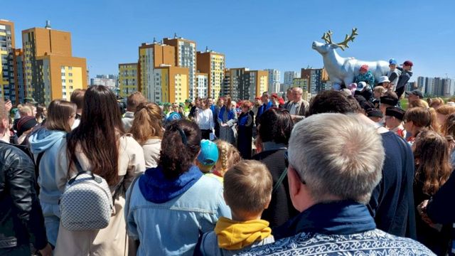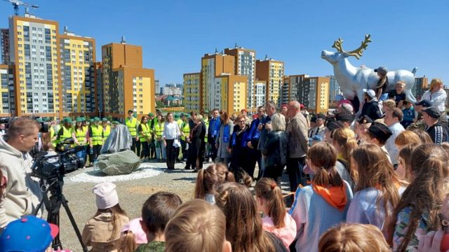 Днем здесь состоялось торжественное открытие сразу двух новых символов района. Так, неподалеку от уже полюбившегося академчанам северного оленя «поселился» медвежонок – скульптура олицетворяет одновременно и ребенка, и весь уральский край.