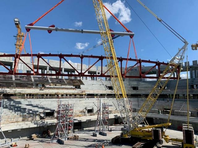 Он добавил, что ферма была собрана на Нижнетагильском заводе металлических конструкций. При изготовлении использован 41 элемент, скрепленный между собой 8 750 высокопрочными болтами. Поднимал конструкцию гусеничный монтажный кран TEREX-DEMAG CC2800 с длиной стрелы 72 м.