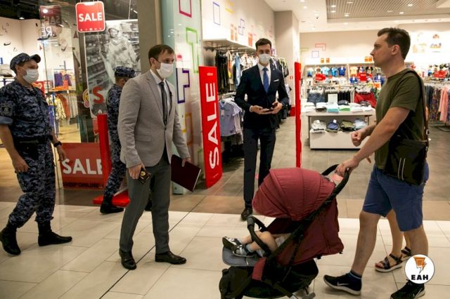 В торговых центрах Екатеринбурга проходят рейды регионального министерства общественной безопасности, и Росгвардии. Сотрудники министерства подходят к посетителям ТЦ, снявшим маски, предупреждают об ответственности, и просят надеть СИЗ. В магазинах инспекция проверяет наличие антисептиков, разметки, и запаса масок для покупателей.