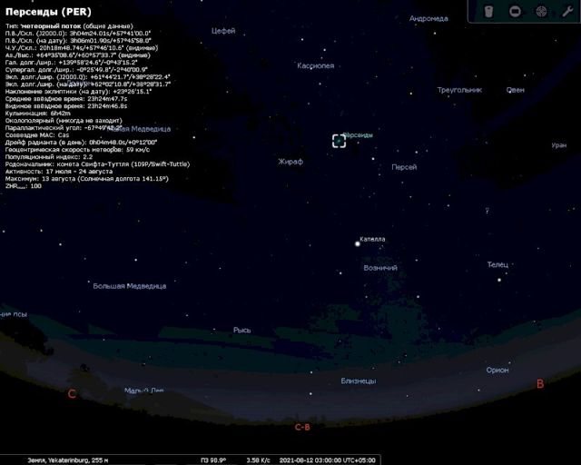 «Пожалуй, в этом году сложатся одни из самых благоприятных условий для наблюдения метеорного потока Персеиды. Ночью ожидается благоприятная ясная погода. Свет Луны (11%) не будет мешать наблюдениям после 23:00. К сожалению, комета-прародительница потока сейчас находится вблизи афелия за орбитой Урана. Благодаря тому, что в метеорном потоке часто встречаются крупные пылинки, одиночному наблюдателю удается наблюдать даже в черте города несколько десятков падающих звезд», - рассказал ЕАН астроном из УрФУ Владилен Санакоев.