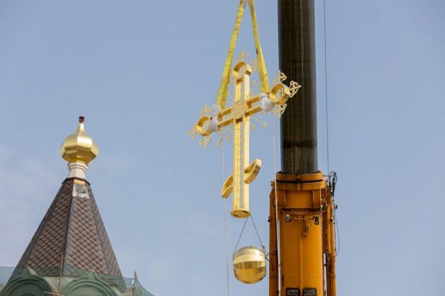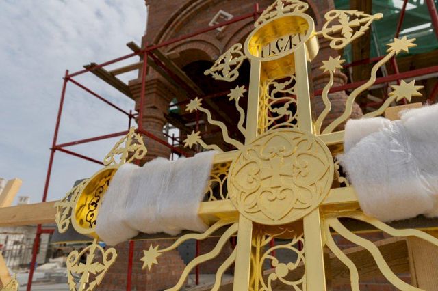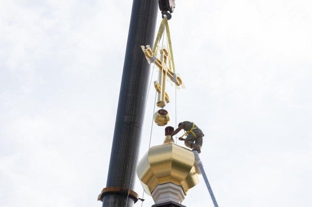 Сегодня на храме воздвигли крест высотой 2,6 м. Монтажные работы проводились при помощи огромного крана, а перед установкой кресты прошли обряд освящения. Его провел благочинный Сысертского округа протоиерей Димитрий Черняк в сослужении с настоятелем храма Андреем Костаревым и представителями духовенства. Установка креста – это уникальное событие, которое можно сравнить с днем рождения храма.