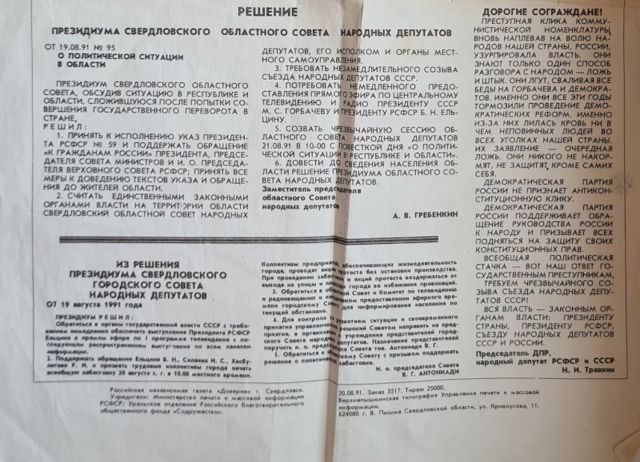 вице-президента, руководителей армии, КГБ и МВД не помогло: региональные элиты в большинстве своем либо выступили против путча, либо предпочли «потеряться», отказав его инициаторам в поддержке. О том, как сопротивлялся 19 - 21 августа один из самых решительных городов - Свердловск, в материале-воспоминании ЕАН.
