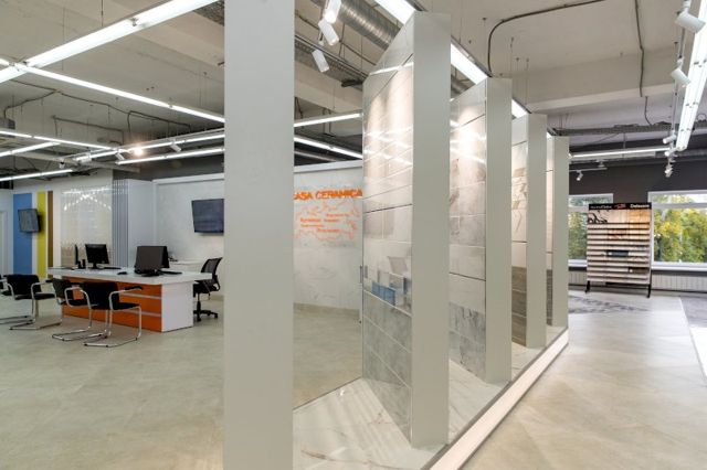 CASA CERAMICA же – это магазин абсолютно другого формата. На площади около 300 кв. м разместился современнейший шоурум, в котором продуман буквально каждый элемент пространства: колонны, декорированные разными видами плитки, большое количество стендов с разнообразными коллекциями. Примечательно, что стенды, на которых представлена продукция, также были изготовлены на Заводе керамических изделий.