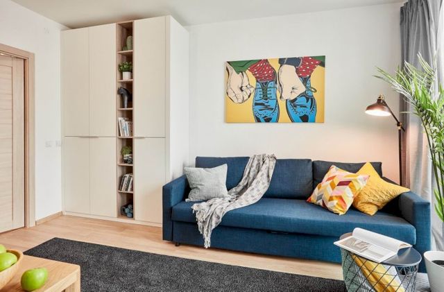 Мебелью оснащен пул студий, 1-комнатных и 2-комнатных квартир, в том числе евроформата. Вся корпусная мебель выполнена по индивидуальным размерам каждой квартиры. Общее стилевое решение – в тон чистовой отделке класса «Стандарт+»: светлые фасады, текстура дерева, нейтральный серый в текстиле. Меблировка отличается оттенками и конфигурацией прихожей и зоны ТВ, при этом выступает универсальной и функциональной основой, которая позволяет воплотить множество идей в дальнейшем обустройстве жилья.